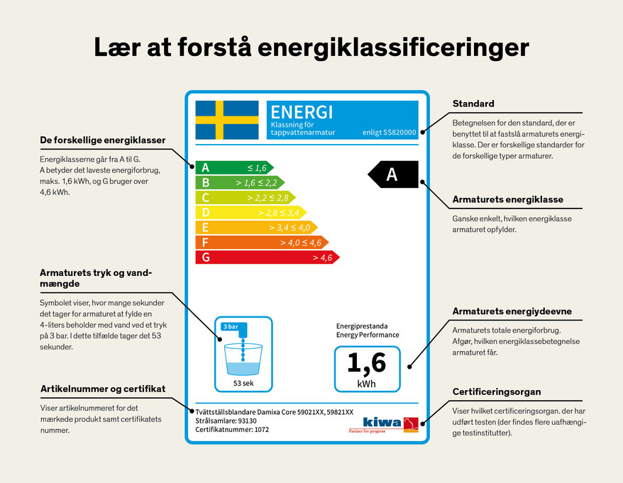 Energiklassificeringen giver dig mulighed for at sammenligne produkters energiydelse samt funktion. Ifølge KIWA, en svensk certificeringsinstans inden for energicertificering, kan husholdninger spare op til 40% af energiforbruget for varmt vand, ved at installere energieffektive sanitetsprodukter.* Derfor mener vi i særdeleshed at energiklassificeringen er vigtig, så du har en garanti for, at vores produkter ligger i top.