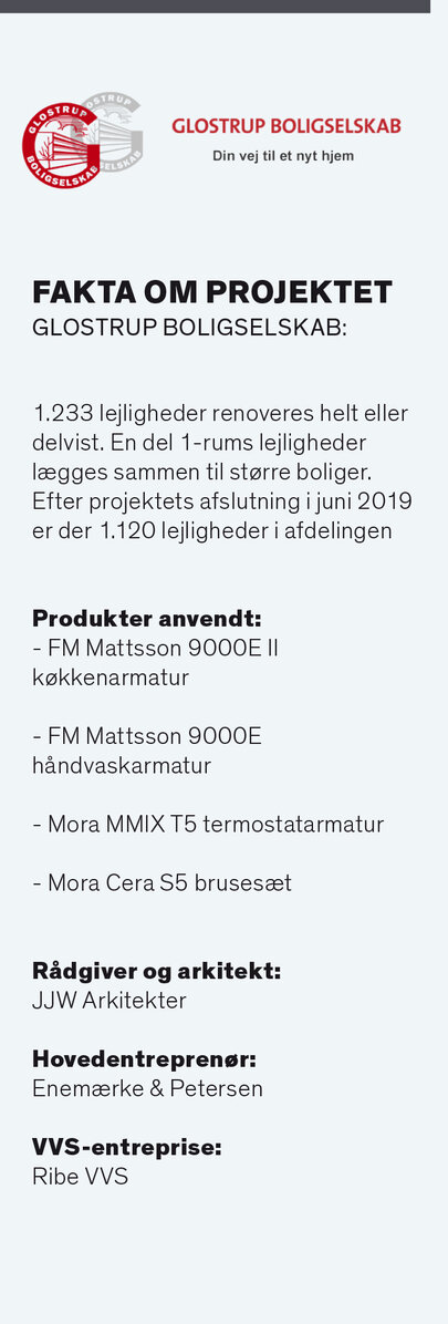 Renoverede lejligheder får flotte, vandbesparende armaturer fra FM Mattsson Mora Group. Kvalitet, holdbarhed og servicevenlighed er nogle af de faktorer, Glostrup Boligselskab har lagt vægt på. Men selskabet og beboerne kan også se frem til besparelser på vand- og energiforbruget.
