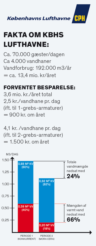 - Vi har dokumenteret 900 kr. om året i besparelse per armatur. Det betyder, at en ny vandhane er tjent hjem på under 2 år, siger Niels Hunderup. Efterfølgende har lufthavnen købt 250 nye vandhaner og udskiftet armaturer i administrationsbygningen samt på de store toiletter på begge sider af sikkerhedszonen. Også her bliver forbruget fulgt tæt, for at kunne vurdere om investeringen her kan betale sig og har samme korte tilbagebetalingstid: