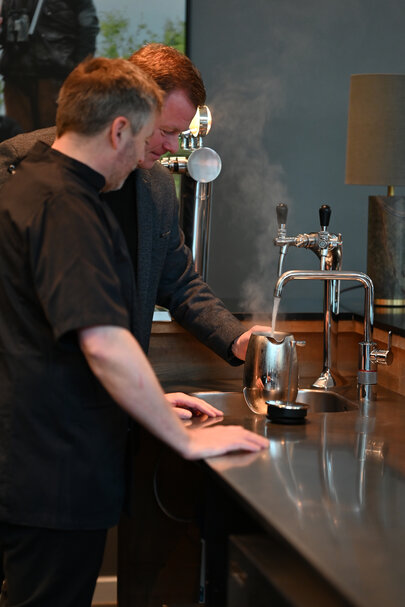 Ovre i baren står én af Pasfall’s tjenere og er i gang med kafferservingen til restaurantens gæster. ”Vores nyeste installation er Silhouet Instant, som er en vandhane med kogende vand-funktion. Vandet er renset og kalkfrit, så vi bruger den ofte til varme drikke eller til at gøre glassene varme ved lige at køre en gang kogende vand i, før vi serverer for eksempel en Irish Coffee.”, fortæller Thomas Pasfall.