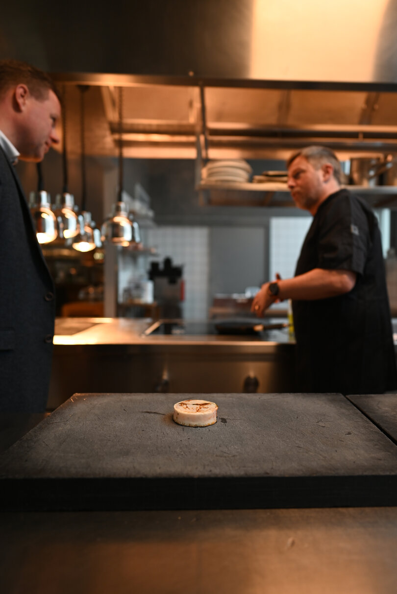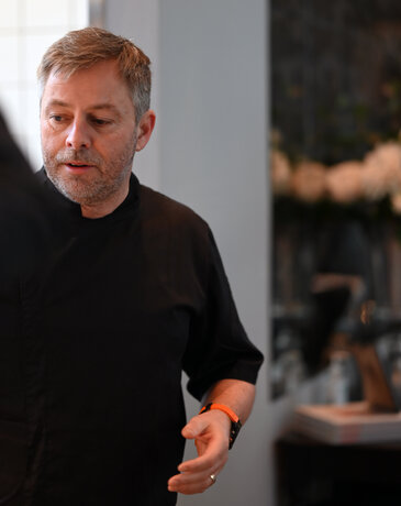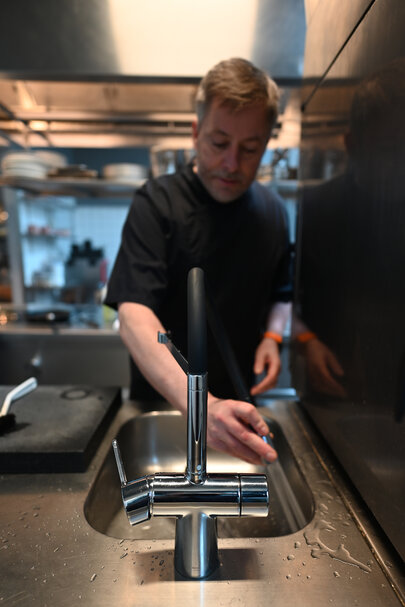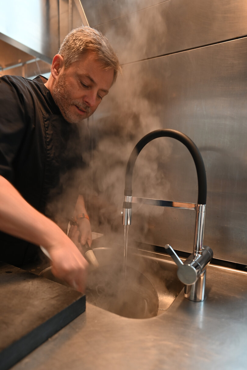 Derfor er det også vigtigt, at omgivelserne er i orden, så kokkene ikke skal bruge tid på ufornødenheder under deres arbejde. Køkkenet er derfor opført i lækre, holdbare materialer, som både er holdbare og æstetiske. Over de to vaske, står to Damixa Silhouet Touchless Pro installeret. Vandhanerne aktiveres let, når hænderne stikkes ind under tuden. ”Det er vigtigt, at det bare fungerer. Vi serverer rigtig mange retter og hygiejnen skal altid være i top. Derfor er det genialt, at jeg kan vaske hænderne grundigt i den perfekte temperatur uden at røre ved vandhanen, så jeg hurtigt kan komme videre med mit arbejde. Samtidig arbejder vi en et åbent køkkenmiljø, hvilket også betyder, at vandhanen ikke bare skal være praktisk, men også æstetisk flot at se på. Det skaber helheden i oplevelsen”, siger Thomas Pasfall, men han tager panden af komfuret og hen under vandhanen, som straks tænder for vandet, og fortsætter: ”Den vinder ved mig, fordi den også har den fleksible tud, så vi let kan klare rengøringen, selv helt op af kanten. Jeg tænder altid for strålefunktionen, så jeg får alt skidtet med.”