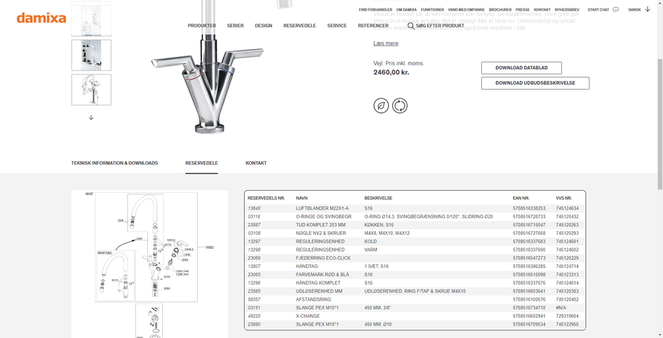 Det er helt enkelt at finde frem til et produkts reservedele. Filtrér dig frem til det konkrete produkt, åbn varekortet og tryk herefter på 'reservedele' under produktbilledet over det grå felt. Her finder du både ean, vvs- samt artikelnummer, lige til at kopiere ind i en ordre, en mail eller i google.