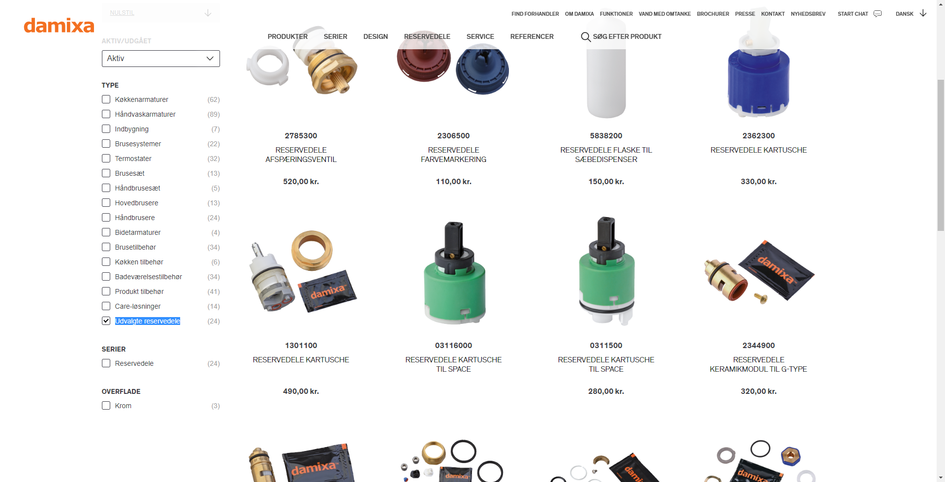 Det vil vi naturligvis også gerne hjælpe dig med. Derfor viser vi herunder vores hyppigst anvendte reserveldele. Ved at trykke på billedet, har du mulighed for at se hvilke færdigvarer, reservedelene indgår i. Hvis du ønsker at se den komplette reservedelsliste til et specifikt armatur eller brusesystem, skal du søge eller filtrere dig frem til produktet og herefter trykke på reservedelsfanen under produktbilledet.