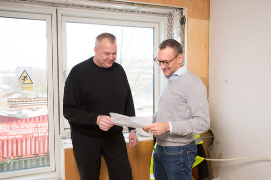 Ejendomsleder Allan Olsson (t.h.) har sammen med energirådgiver Claus Dennis Jønsson skræddersyet renoverings-projektets VVS-del og foretaget målinger, der dokumenterer den forventede energibesparelse på 46 %. Derudover har armaturenes tekniske features som bl.a. temperaturstyring og trykstøds-begrænsning spillet en stor rolle i valget af leverandør.