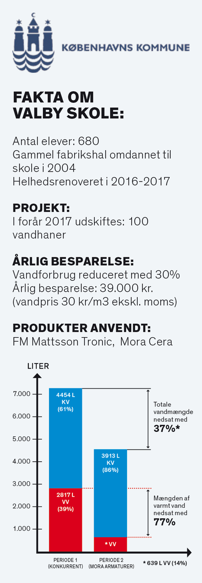 Vandhaner, der bare løber uden at blive slukket, eller som bruger unødvendigt meget vand, når der skal vaskes hænder, er snart historie i over halvdelen af de københavnske folkeskoler. Københavns Kommune har i en årrække haft fokus på at renovere kommunens gamle nedslidte bygninger og mange er blevet istandsat under paraplyen ”helhedsrenovering”, men i den proces er der tænkt mere bygningsskal end energibesparende interiør.